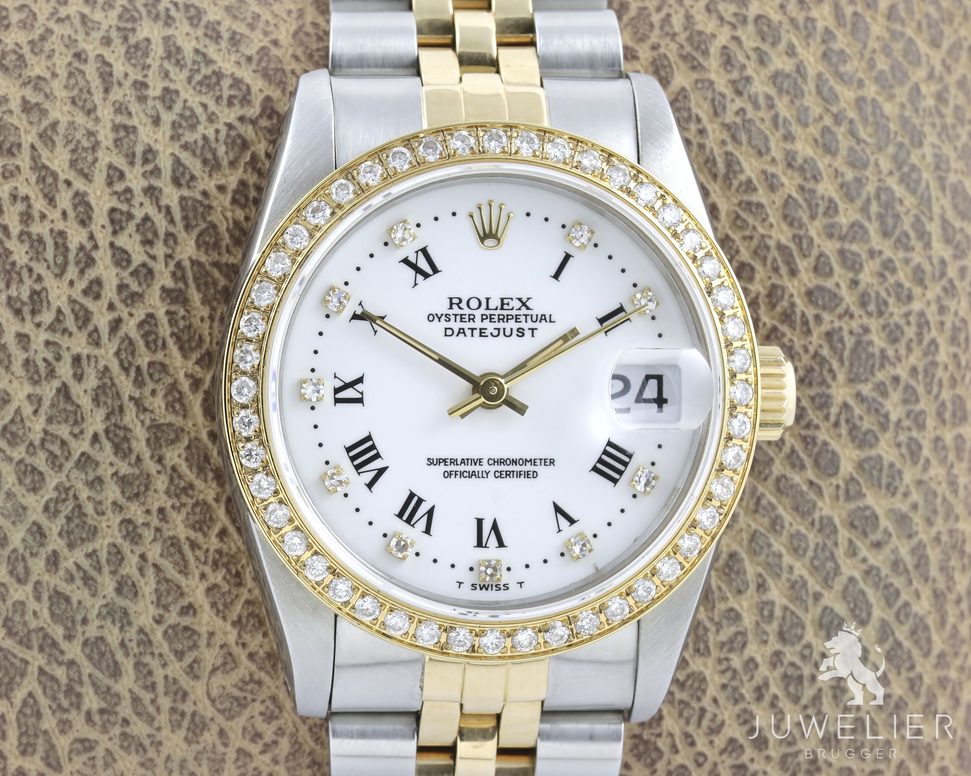 Edles weißes Zifferblatt mit römischen Ziffern und orig. Diamantenbesatz.