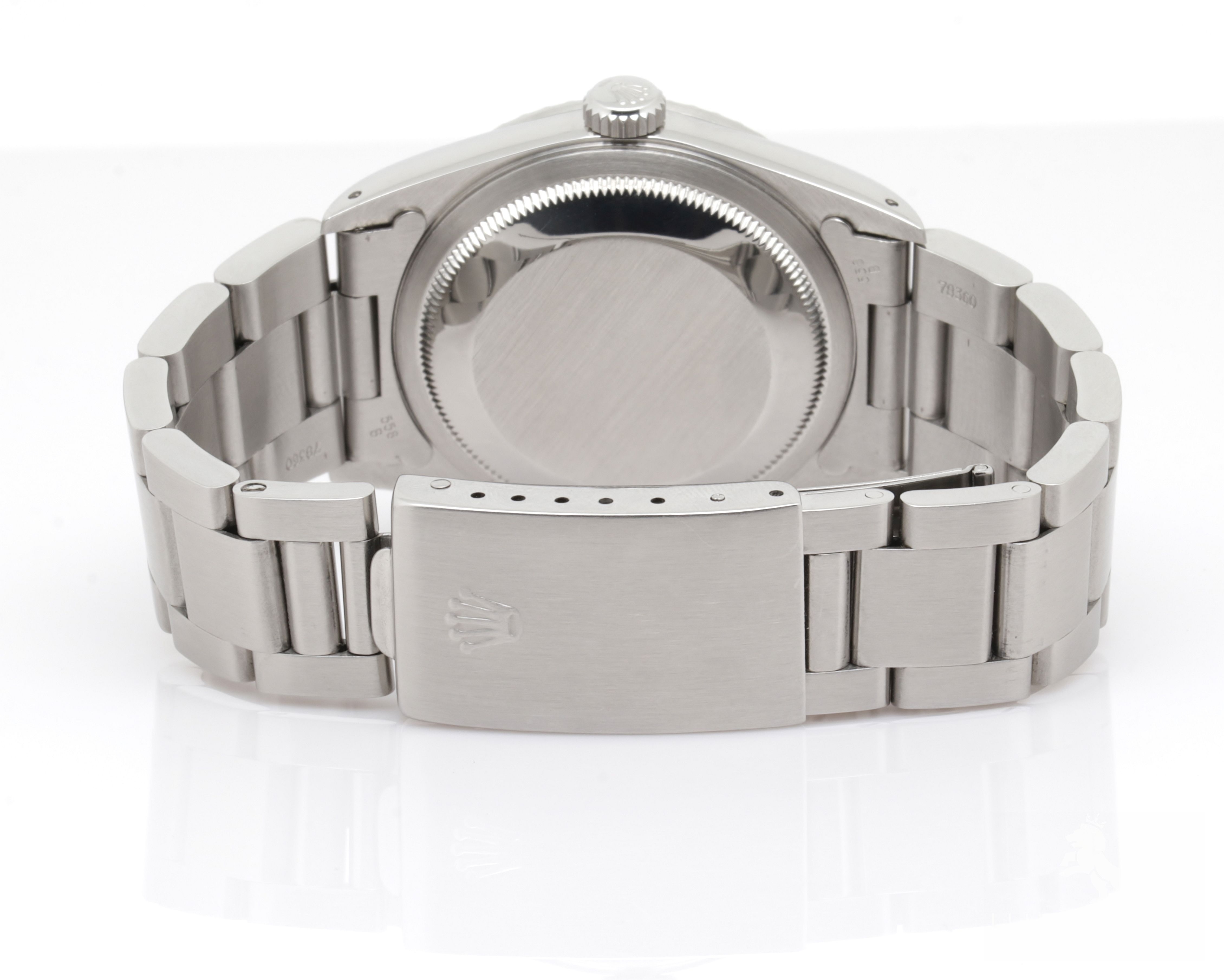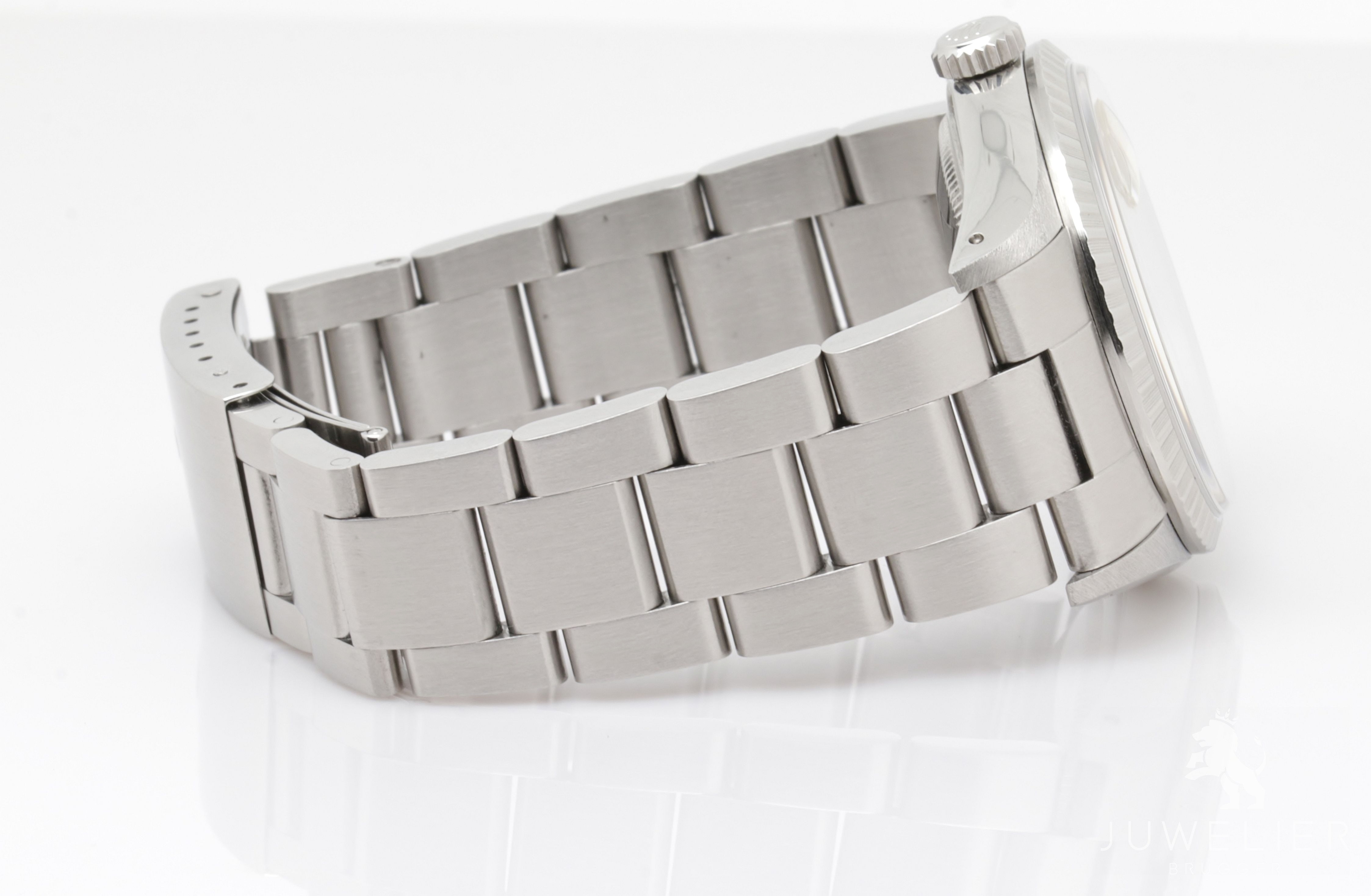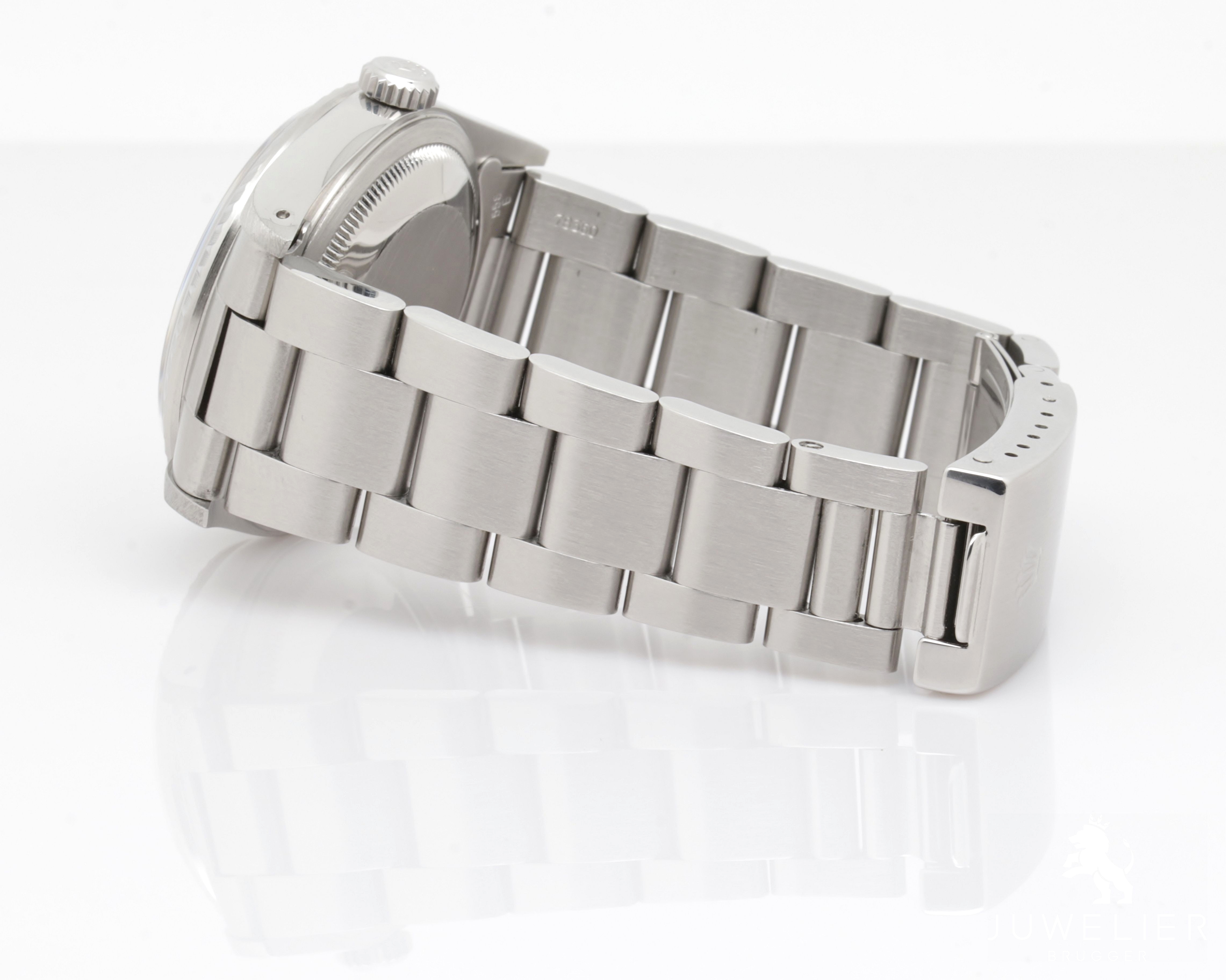 Sportliches Oysterband aus Edelstahl – die maximale Länge des Bandes beträgt etwa 19cm, gemessen mit Gehäuse, verstellbar, zusätzliche Glieder erhältlich.